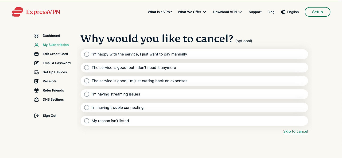 For example, let’s see how Express VPN does it. When a user selects a reason for unsubscribing, they immediately see the potential downsides of leaving — the so-called "undesired outcome." While we usually emphasize the positive outcomes or successes that our service can bring, addressing unsubscriptions requires highlighting what users might miss out on if they leave. This approach helps underline the value of staying subscribed.